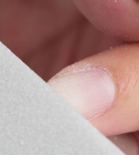 Pokud máte dlouhé nehty, nejprve bude nutné je zkrátit pilníkem, ideálně half moonem 100/180. Nesundávejte celý materiál, nechejte trochu zbylé modeláže a zdrsněte přírodní nehet.