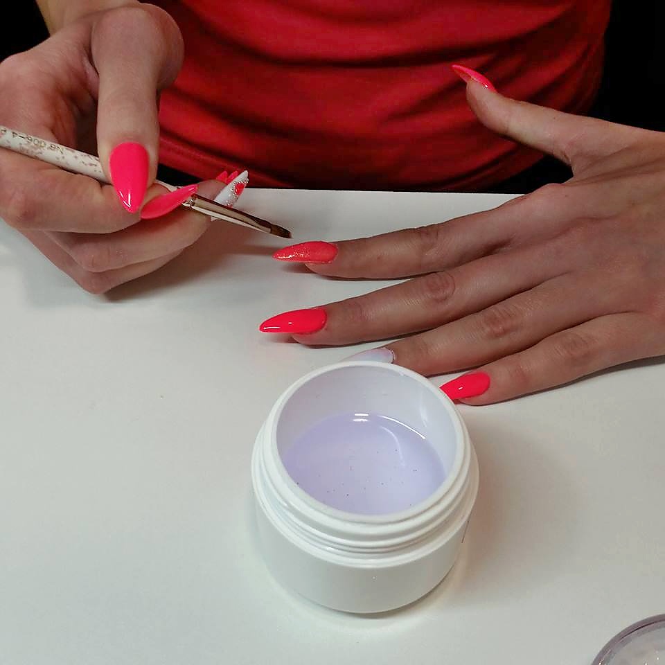 Štetcem o velikosti 6 (vyšším číslem nanesete více materiálu) naneste stavební gel v nejvyšším bodu vzrůstu, aby nehet z boku měl tvar mandličky. Vytvrdíme 2 minuty. Nehet zpilujeme do požadovaného tvaru a naneseme barevný gel dle fantazie a vkusu, opět tvrdíme 2 minuty a na závěr je nutný nanést finish gel, čili lesk.