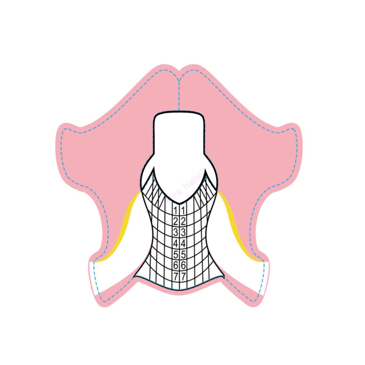 Šablonku sejměte z podkladu, perfomovaný střed slouží pro zpevnění šablony. Šablonu si vystřihnete dle tvaru nehtu, u valů se provádí nůžkami tzv. nástřih pod úhlem 45 stupňů.