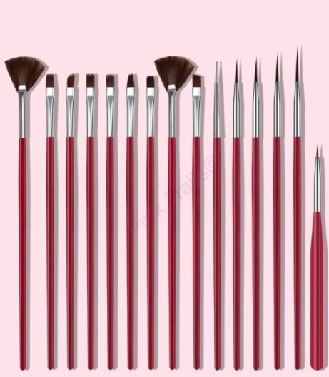 Sestava 15 štětců s umělým chlupem, vhodné na nanášení gelů a třpytek.